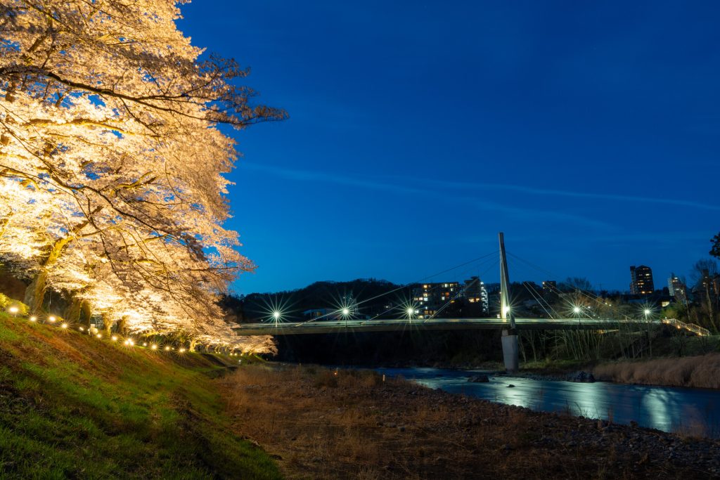 川岸に広がる約200mのライトアップされた桜並木をお楽しみください。